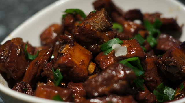 排骨冷水下锅,冷水里放点绍酒和姜,煮开后,离火,把肉彻底冲洗干净,沥干。油锅里放油,如果排骨较肥的话,我会用小火把油先逼出来,然后,放大量黄冰糖,等糖溶化,起泡,立马把排骨放入,快速翻炒,让排骨上色,然后,加入绍兴黄酒,镇江香醋,一碗水,一点生抽,大火煮滚,小火煮45分钟,到一个小时。然后,大火收汁,快收干,粘稠时,最后定味,再加入一点绍酒,和香醋,葱花,用一点点水淀粉勾芡,出锅。撒上白芝麻即可。葱花用不用看个人口味,我自己认为葱香味和糖醋味听般配的。