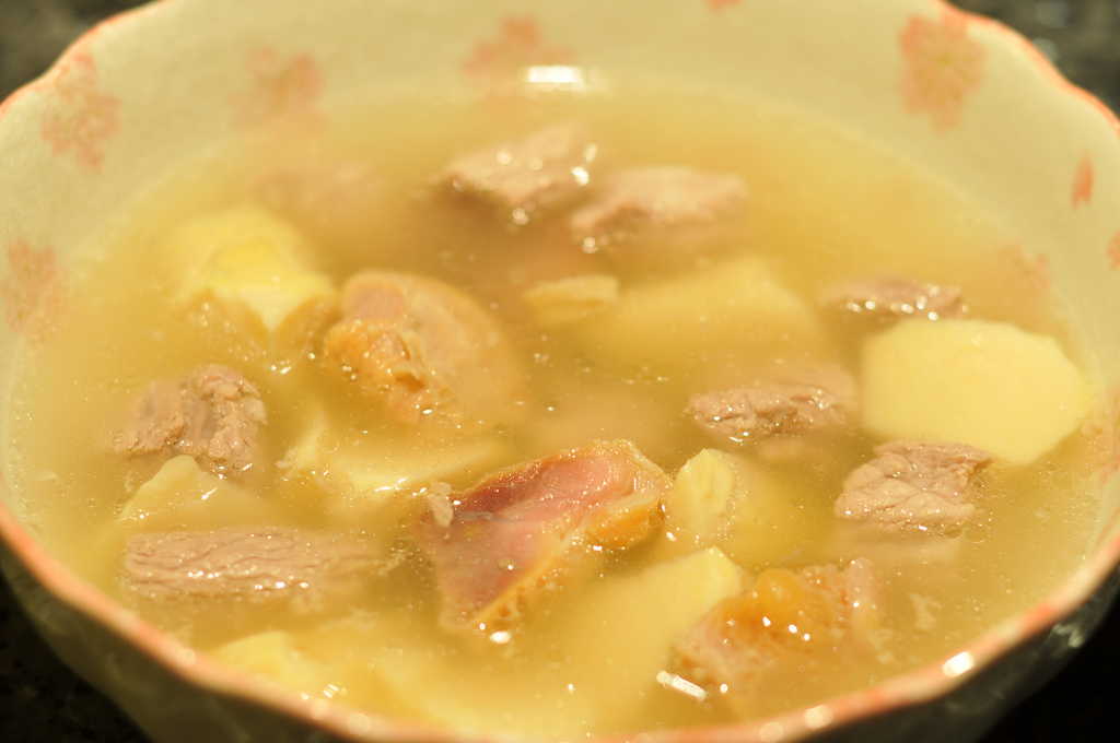 温哥华这里没有好的咸肉卖,我试过用从烧腊店里买的火腿,味道也不错。不过,还是觉得自己腌的咸肉最好:买一块猪肉,什么部位都行,用花椒和盐,盐要多一点,均匀地抹遍每一个角落,可以多抹几层,然后挂在低温通风的地方,等肉发硬就可以了。这里是没有春笋卖的,所以,只能用冬笋代替,千万不能用罐头笋,否则,整锅汤就砸了。先把鲜猪肉切块,焯滚水,洗净血沫,然后放入锅内,加水,加黄酒,加切成块的咸肉,加切成块的冬笋,让汤沸而不滚,再经过两个半小时那诱人香味的折磨,你就可以慢慢享受这人间的美味了。