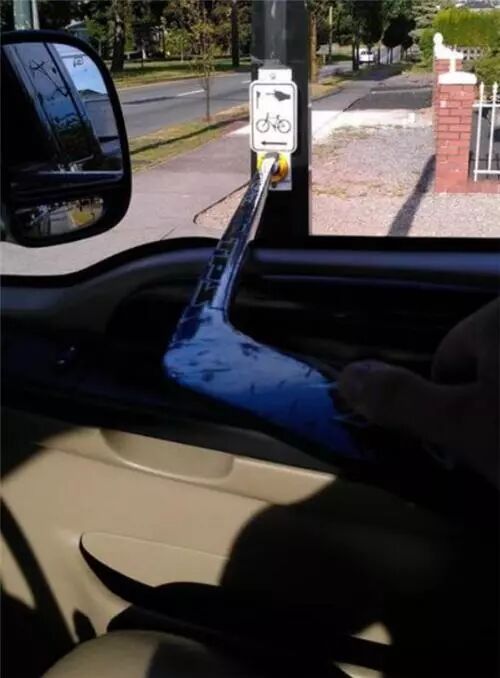 加拿大有很多行人控制的路口,有的时候你想左转,发现根本没有行人。主干道车流量大,等了几分钟都没法转。因为你是司机,也不可能解开安全带下车去按按钮。那么,为何不备一个冰球杆在车上呢?