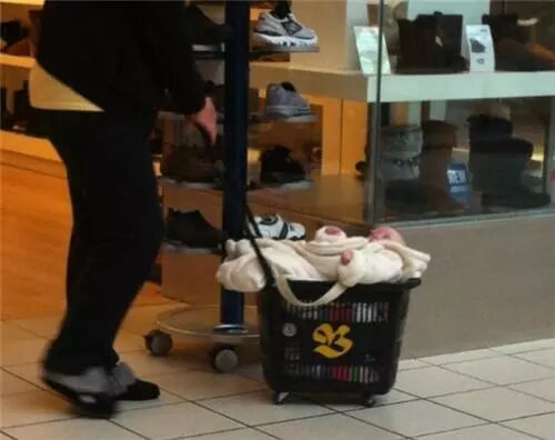 竟然把宝宝当做商品直接装在了购物篮里推着走……恩,孩子,你将就将就!