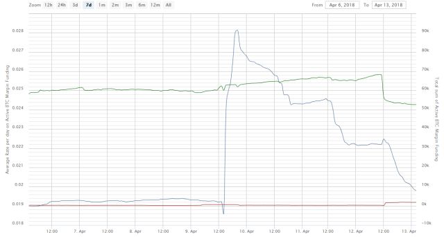 另外一种币师更认同的可能就是没有什么别的信息面的理由,仅仅是因为有大资金盘手利用最近市场上积累的空单来了一次技术上的绝杀。如上图所示,在本次拉涨前,4月9日曾经也出现过爆砸,而砸盘的杠杆进货资金也同样来自于Bitfinex。那天也是血流成河,不少做多的投资者爆仓的尸骨无存。然后在不断的震荡横盘中,就在拉盘前的两三个小时,还砸了一波,诱空。就在许多做空的投资者都以为会重演4月9日的砸盘时,突然一根大绿柱直接拔地而起,一个小时内涨10%把基本上所有刚下的空单全都吃掉,其中不乏千万级的单子。可以看以下这种BITFINEX的比特币期货杠杆持仓图,蓝色的线代表的是平台上期货杠杆交易的仓位水平,在9号的时候突然增加,可以看成做空的资金进入,然后缓慢比例下降,到昨天突然直接几乎回到原点。而绿色的线是期货杠杆的BTC总数量,昨天突然一个下跌,可以看成就是做空资金直接被盘手割走离场了,刚好吃的就是4月9号这一波入场的期货杠杆投资者。