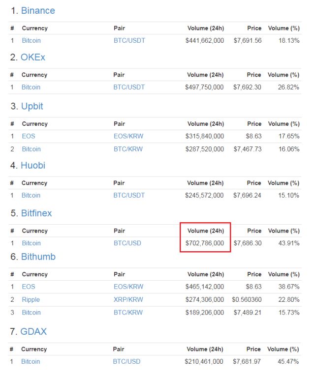 首先,我们来看一下以下这张图,这张图是币师在本文发出之时从Coinmarketcap上截取的世界上主要交易所的交易额度。