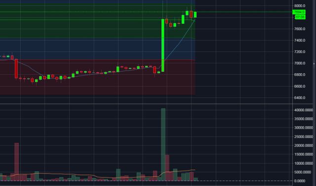 4月12日,比特币现货交易市场突然产生了剧烈波动,先是一波小下挫,从6950美金下跌至6750美金左右。在几个小时后回拉至6900,然后在一小时内爆裂拉升10%直接突破近期关口8000。在爆拉的这一小时内,BITMEX等期货合约交易平台出现超过两亿美金的做空资金被直接强制平仓,给做空者带来了巨额损失,同样也给做多的投资者赢来了超额回报。