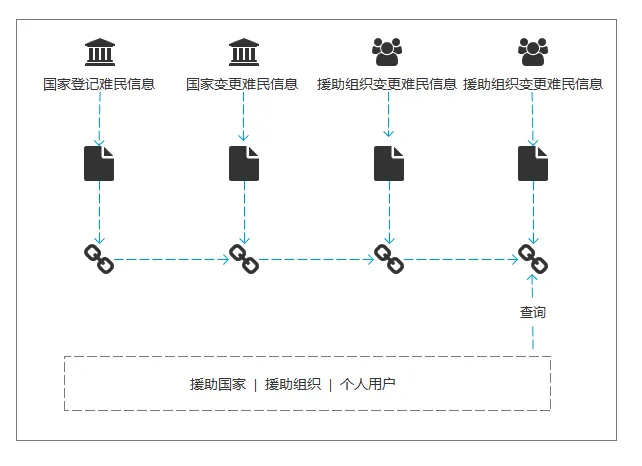 现在,通过区块链技术的防篡改、分布式储存等特性,援助国家对难民信息进行上链登记,参与链上的各方可以进行数据共享。当援助国家接收难民的时候可以对难民信息进行登记,包括家庭成员、联系方式、逃亡路线等,方便对难民进行后续的援助,如寻找亲人、发放救助食物、帮助返回祖国: