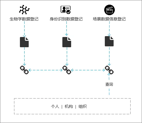 将个人信息,包括生物学数据、身份识别数据、场景数据信息等上链加密存证,数据可实时更新,区块链不可篡改的特性可防止数据丢失或篡改。