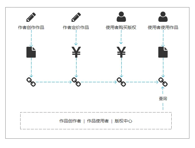 现在,创作者在平台上进行作品创作,作品创作过程登记到区块链上,完成创作后对产品进行定价。个人可以通过智能合约的调用对版权拥有者进行支付,支付完成后获得版权的使用权或拥有权: