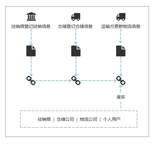 现在,经销商发货时对货物信息进行上链登记,物流的运输过程也将在链上同步更新信息,消费者收到货物后可以在链上进行货物的溯源: