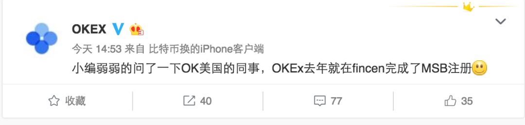 2.OKEX官方微博称去年就在fincen完成了MSB注册。