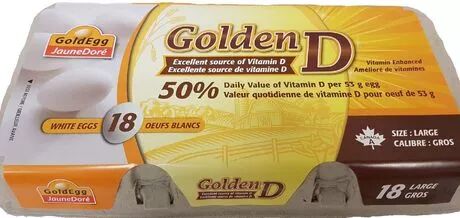 目前市场上出现了一种富含维他命D的新产品鸡蛋Golden D。一个Golden D鸡蛋中的维他命D含量是一个标准大鸡蛋的3倍,这要归功于维他命D加强版鸡饲料。对于长期缺乏日照的加拿大人来说,Golden D鸡蛋非常有用。