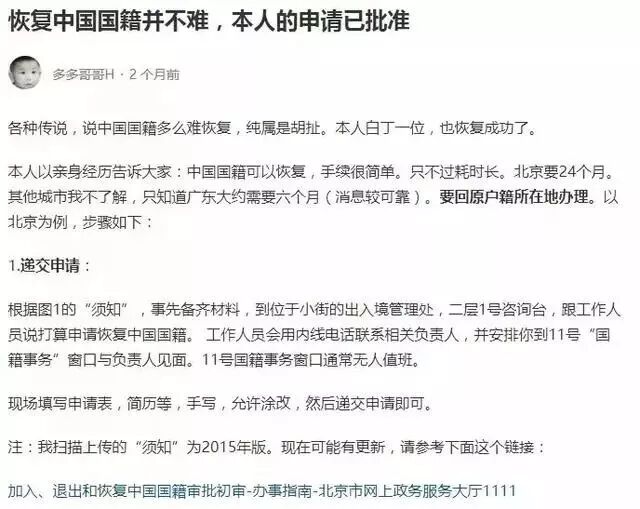 知乎有个网友今年年初发帖子称:恢复中国国籍并不难,并且他的申请已批准!