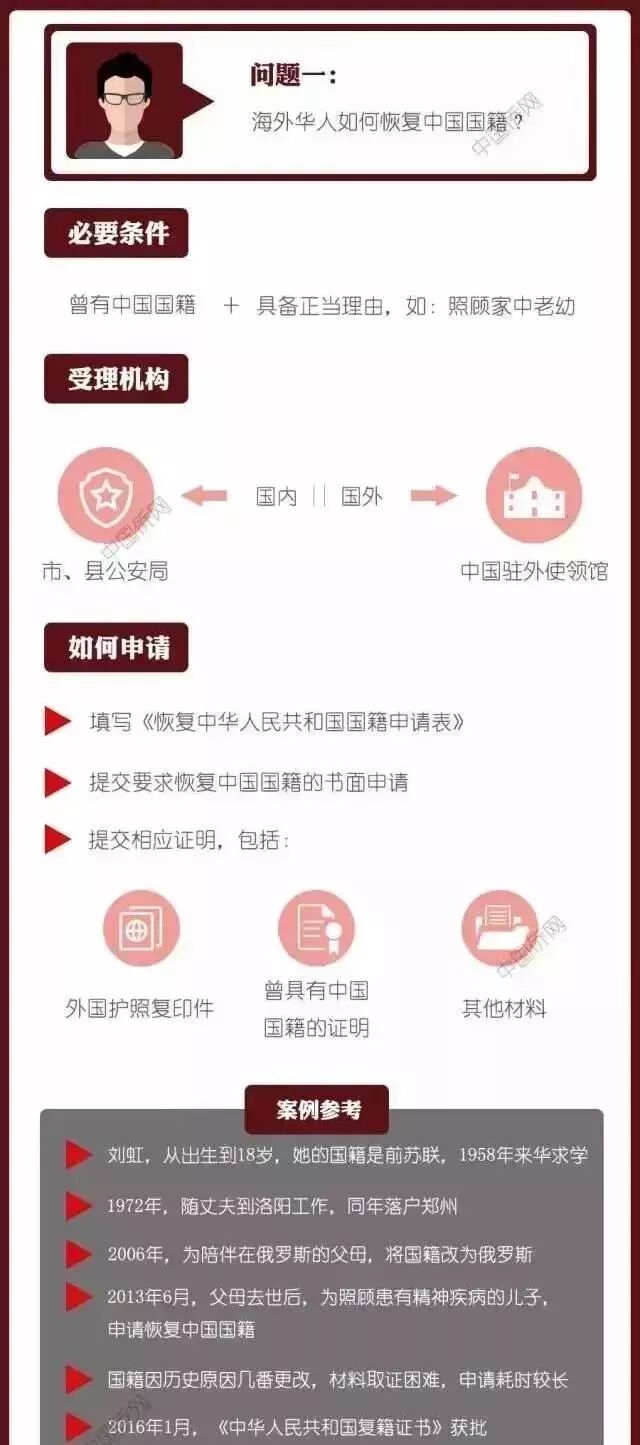 侨网还举了一个例子,一名叫刘虹的女子与2006年入籍俄罗斯,2013年6月申请恢复中国国籍,由于刘虹的国籍因历史原因几番更改,材料取证困难,所以申请耗时较长,2年半后,2016年1月,刘虹获批恢复中国国籍。