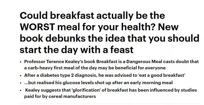 基莱博士发现在西方最早强调早餐重要的研究/新闻都来自食品公司,主要生产麦片、面包等食品那种。