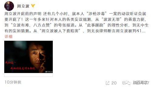 还有几个小时,就本人“涉枪涉毒”一案的动议听证会就要开庭了!这一年多来针对本人的各类妄议揣测,从“波波无罪”的善意力挺,到“立波有难,八方点赞”的夸张报道。从“此事蹊跷”的理性分析,到无中生有的妄加猜测。从“周立波被人下套陷害”,到无良律师断言周立波被判41年……真可谓一石激起千层浪,映照出世间的冷暖、人性的善恶。
