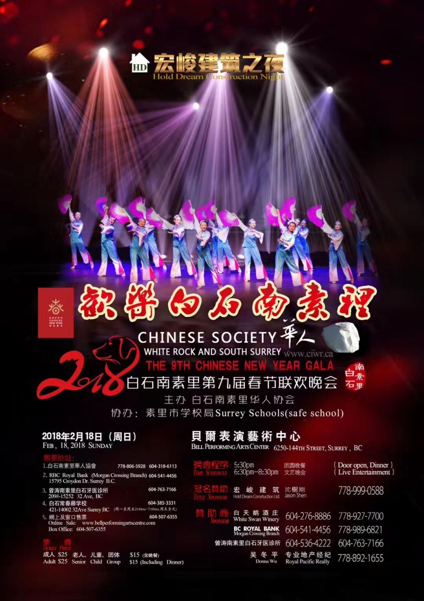 2018年第九届春晚,还将是白石及大温地区最具特色的春晚,团圆晚宴与文艺表演共享,主办方将为观众提供精美晚餐及温馨快乐儿童餐,千人阖家欢聚过大年,届时恰逢BC Family Day公众 假期前夜,中国年作为加国传统节日已被政府立法通过,晚会将诚邀更多社区中西家庭欢度节日。晚会本着奉献社区及公益性原则制定票价,特别是老人及儿童票更加优惠并设有团购票,非常适合大家庭及亲朋好友团聚共享“年夜饭”及欣赏演出。本届春晚突出多元文化展示主题,同时与素里市教育局协作在社区青少年中开展“珍爱生命、远离毒品”为主题宣传活动,届时现场将有丰富的宣传及互动活动邀情大家参加,晚会还将着重为社区青少年提供展示自我的平台。晚会将诚邀著名文化团体、艺术家和社区文艺人才同台献艺,专业舞台、音响、灯光舞美背景提供,节目全新编排呈现,形式丰富多彩。