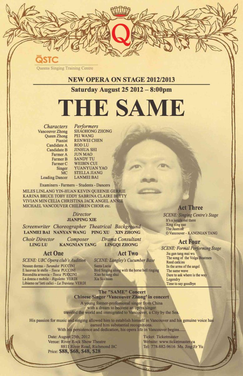 温哥华第一男高音歌唱家钟少弘老师是我们白石华人社区非常熟悉的老朋友了,这一次他将和他的歌舞团共同给大家带来全新的歌舞剧表演,请感兴趣的朋友千万不要错过这场音乐盛会!有关音乐会详情和最新海报如下: