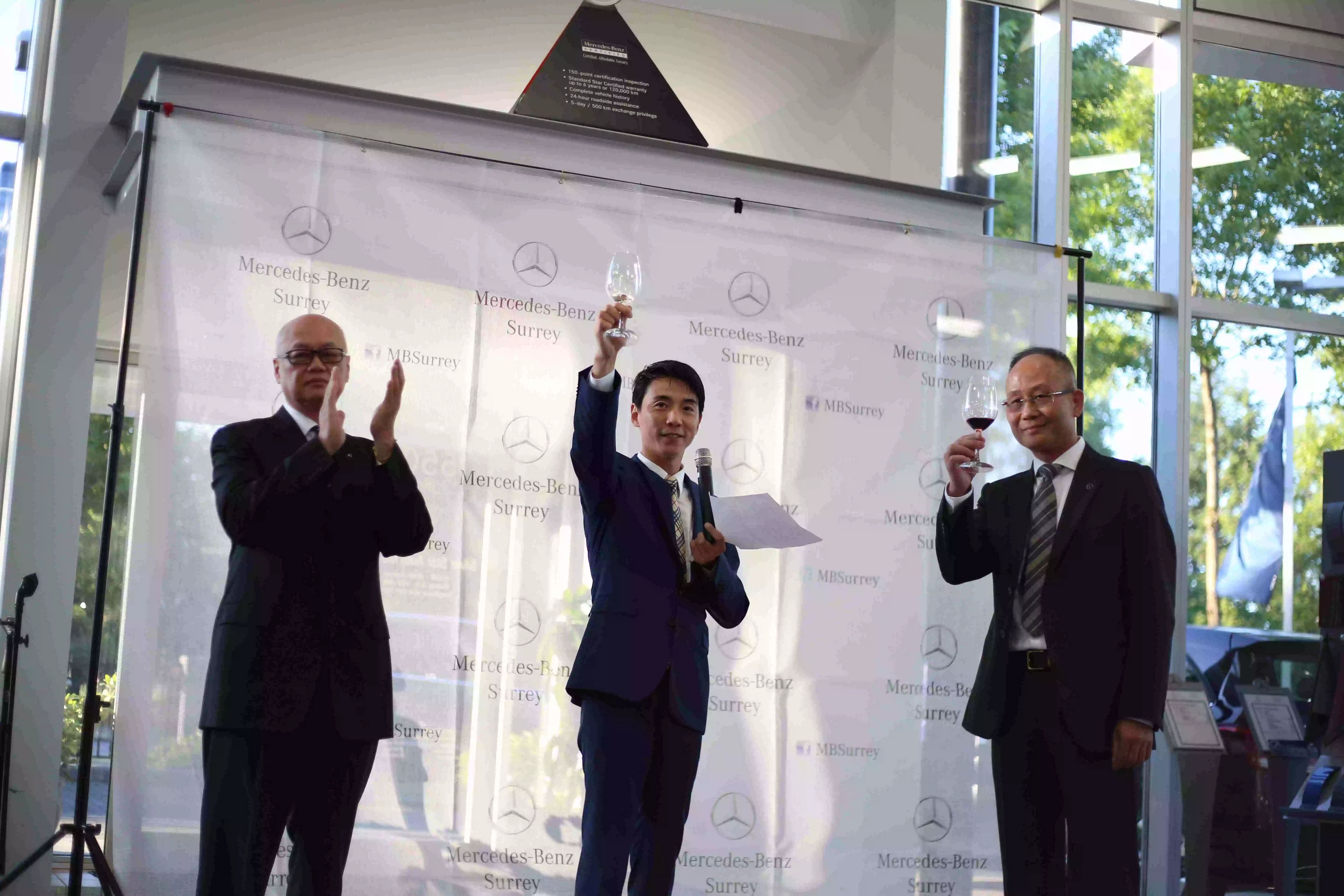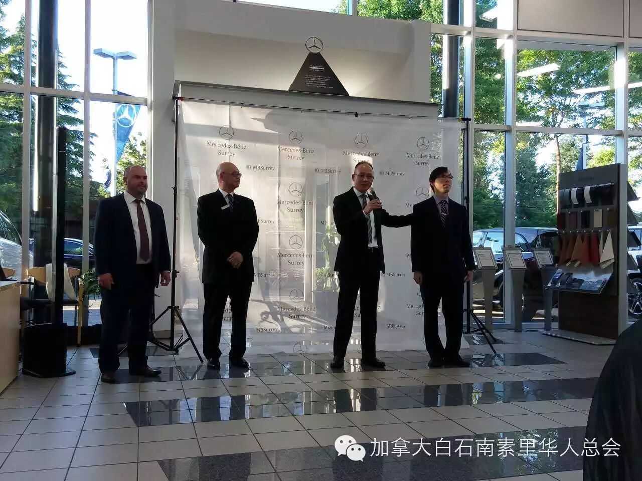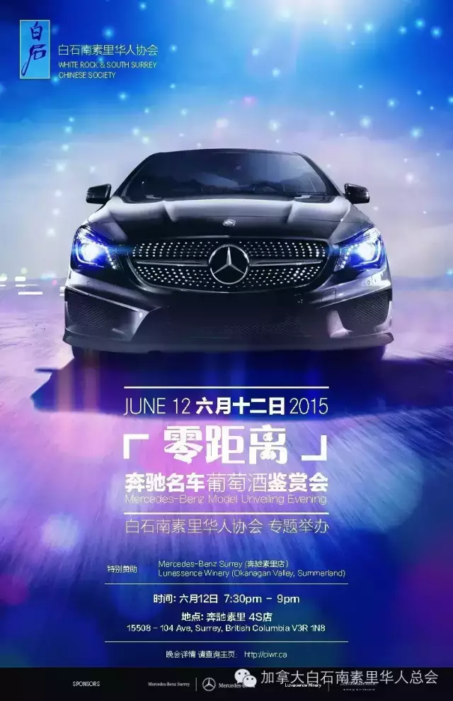 2015年6月12日晚,由白石南素里华人协会主办,奔驰素里店协办以及得到奥肯那根SUMMERLAND的LUNESSENCE酒庄鼎力赞助,在位于北素里104AVE,已服务大温社区奔驰客户二十余年的奔驰素里4S店(MERCEDES-BENZ SURREY)举行了一场“零距离”奔驰名车葡萄酒鉴赏会。